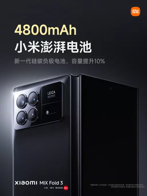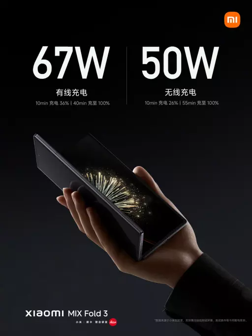 Также Xiaomi Mix Fold 3 наделили двумя аккумуляторами общей ёмкостью 4800 мАч, которые поддерживают 67-ваттную проводную и 50-ваттную беспроводную зарядки, а сам процесс зарядки контролируется тремя фирменными чипами — два Surge G1, отвечающие за саму зарядку, и один Surge P2, равномерно распределяющий заряд.