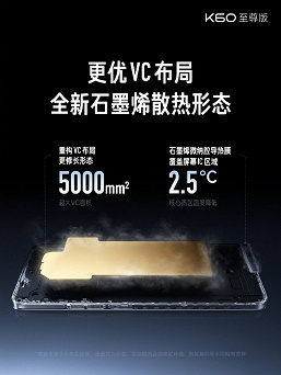 Как и предполагалось, Redmi K60 Ultra построен на мощной однокристальной системе Dimensity 9200+ с системой охлаждения на базе испарительной камеры площадью 5000 мм2, которая на сегодняшний день является самым производительным решением тайваньского чипмейкера MediaTek.