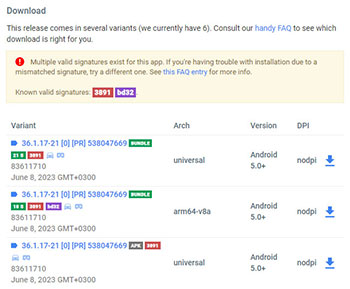 Для того, чтобы скачать на ваш смартфон Google Play переходим в браузере на соответствующую страницу сервиса apkmirror, где нажимаем на самую свежую версию Google Play и выбираем вариант данной версии (рекомендуем universal), после чего появится страница с полным описанием выбранной модификации Google Play и кнопка для её скачивания.