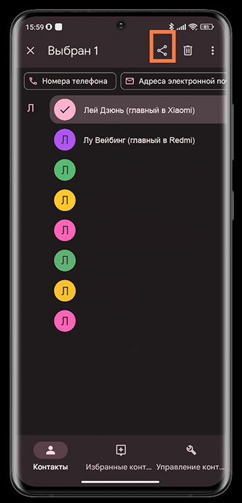 Далее открываем на смартфоне с которого будем отправлять данные приложение Контакты, выбираем нужный для передачи по Bluetooth контакт или с помощью множественного выбора отмечаем несколько.