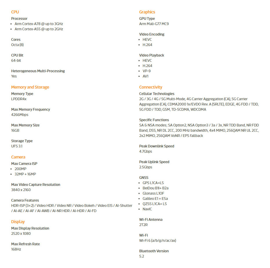 В итоге 6-нм чип MediaTek Dimensity 8050 включает одно процессорное ядро Arm Cortex-A78 с частотой до 3,0 ГГц, три ядра Cortex-A78 с частотой до 2,6 ГГц, четыре энергоэффективных Cortex-A55, работающих на частоте до 2,0 ГГц, а также 9-ядерную графику Arm Mali-G77.