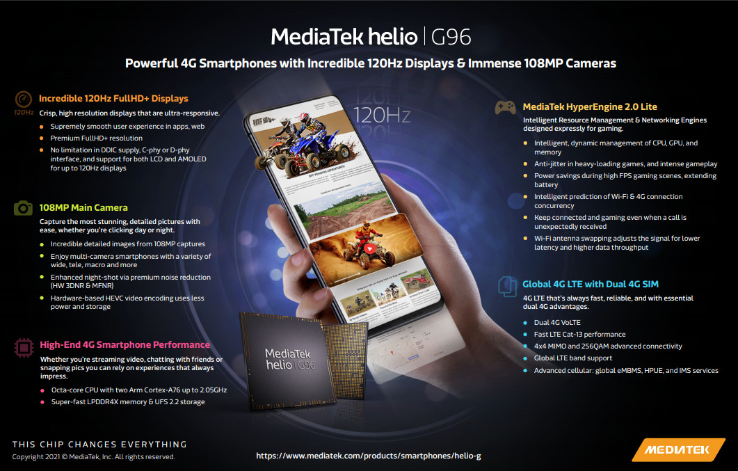Для однокристальной системы Helio G96 заявлена поддержка дисплеев с разрешением до 2520 x 1080 точек и кадровой частотой до 120 Гц, оперативной памяти стандарта LPDDR4X, флеш-накопителей форматов eMMC 5.1 и UFS 2.2, и камер с датчиками изображения до 108 Мп и поддержкой записи видео в 4К разрешении.