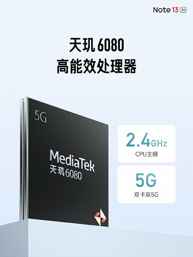 В основе Redmi Note 13 5G лежит 6-нм платформа MediaTek Dimensity 6080, которая фактически является клоном чипа Dimensity 810 родом из августа 2021 года. Это два ядра Arm Cortex-A76 с частотой 2,4 ГГц, шесть ядер Cortex-A55 с частотой 2,0 ГГц, а также графика Mali-G57 MP2.