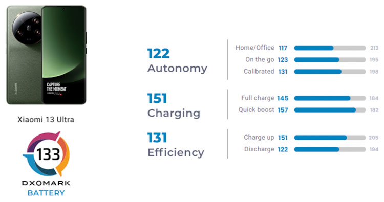Несмотря на то, что Xiaomi 13 Ultra показал не самые лучшие результаты в фото- и видеотестах DxOMark, не попав даже в первую десятку камерофонов, аппарат показал вполне приличную автономность в этой же лаборатории, заняв седьмое место в своей ценовой категории.